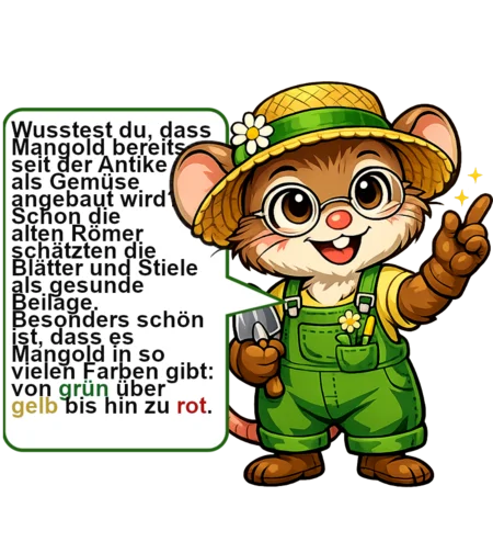 Mangold ist ein robustes Gemüse, das sowohl für Frühjahrs- als auch Spätsaaten geeignet ist. Er ist relativ kälteunempfindlich und kann daher auch in Übergangszeiten gut wachsen. Die Pflanzen bilden große, auffällige Blätter, die je nach Sorte grün oder bunt (gelb, rot, weiß) gefärbt sind. Mangold ist pflegeleicht, wächst zuverlässig und kann mehrfach geerntet werden.